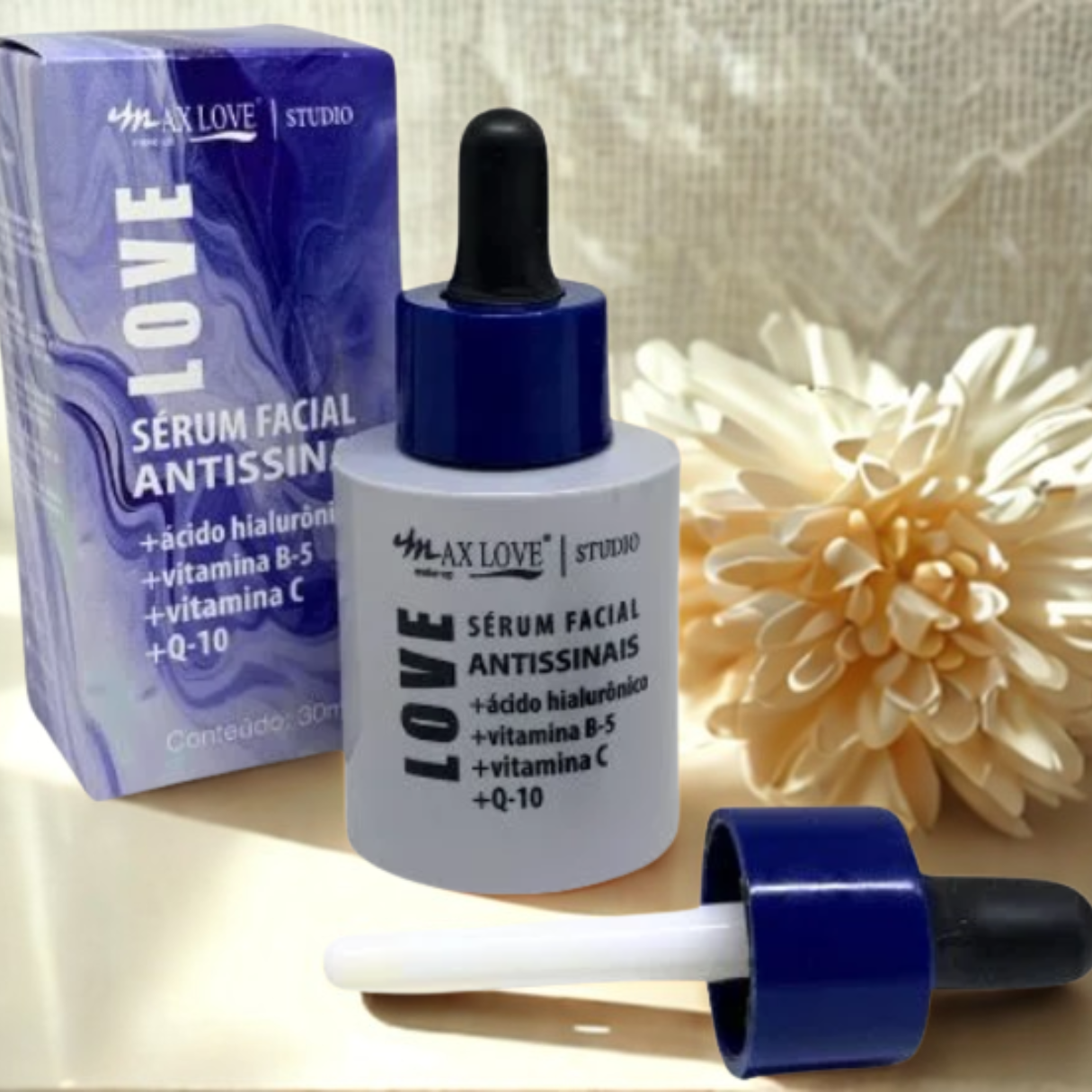 1 frasco de 30ml de Sérum Facial Antissinais Max Love com conta-gotas.